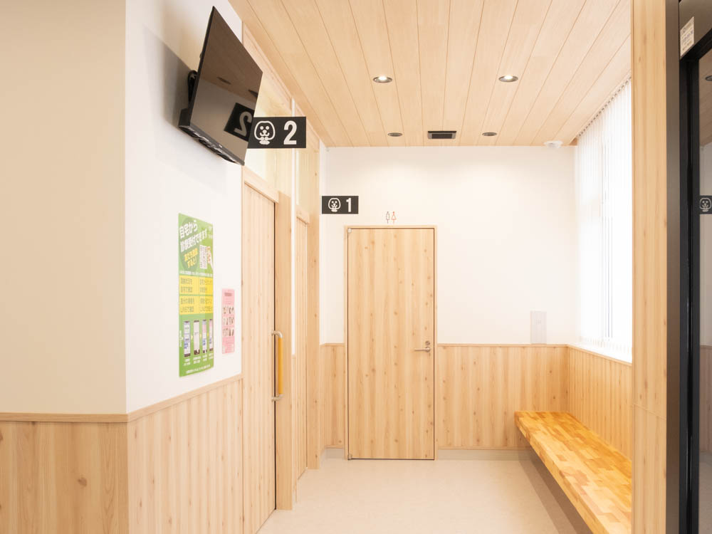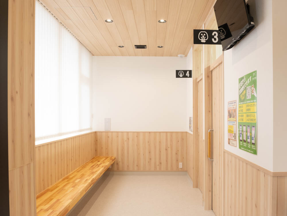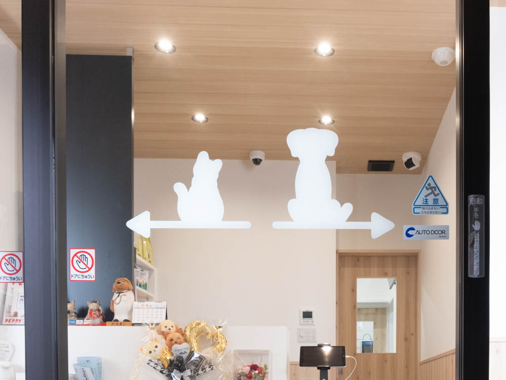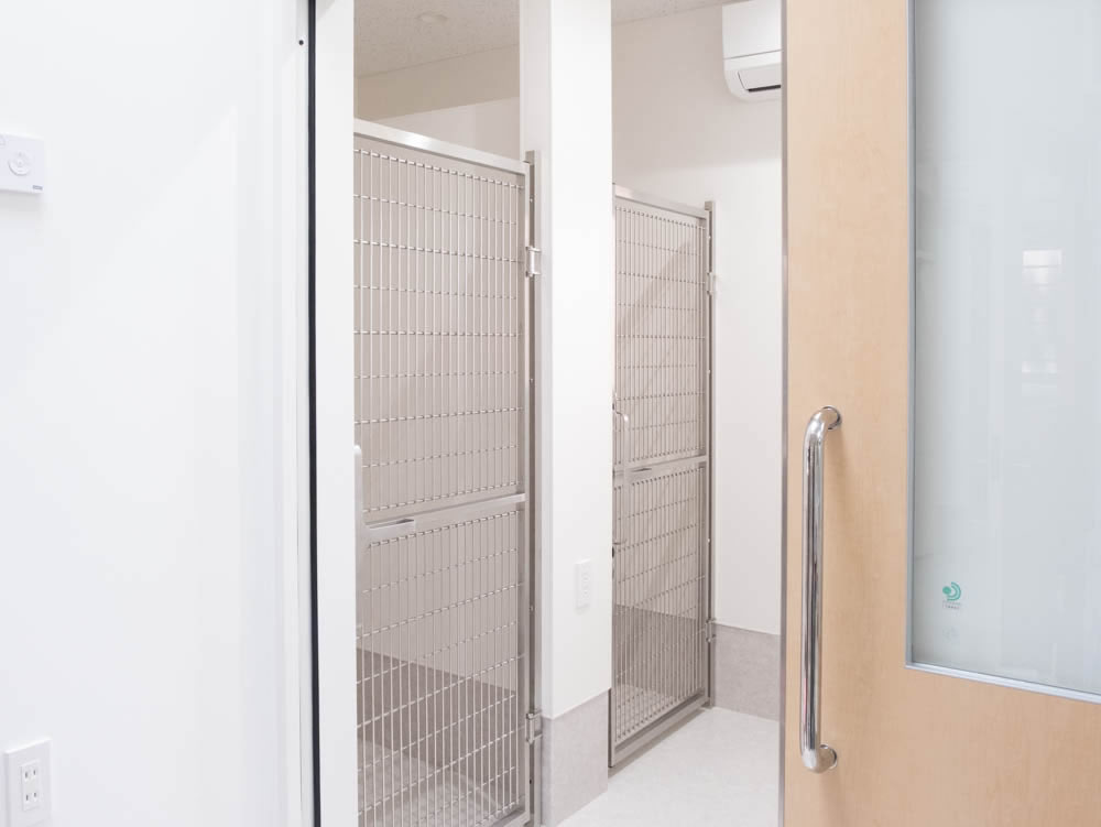 動物たちが安心できるように 当院は動物たちのストレスを軽減させるため、 わんちゃんとねこちゃんの入り口を分けております。 混雑時には大変窮屈に感じると思いますが、 ご理解とご協力ほどよろしくお願いいたします。 入口(左:ねこちゃん 右:わんちゃん) 受付 待合スペース(ねこちゃん診察室3・4) 待合スペース(わんちゃん診察室1・2) 診察室1(わんちゃん) 診察室2(わんちゃん) 診察室3(ねこちゃん) 診察室4(ねこちゃん) 手術室 わんちゃんケージ ねこちゃんケージ 大型犬専用ケージ 隔離用ケージ 院内ドッグラン